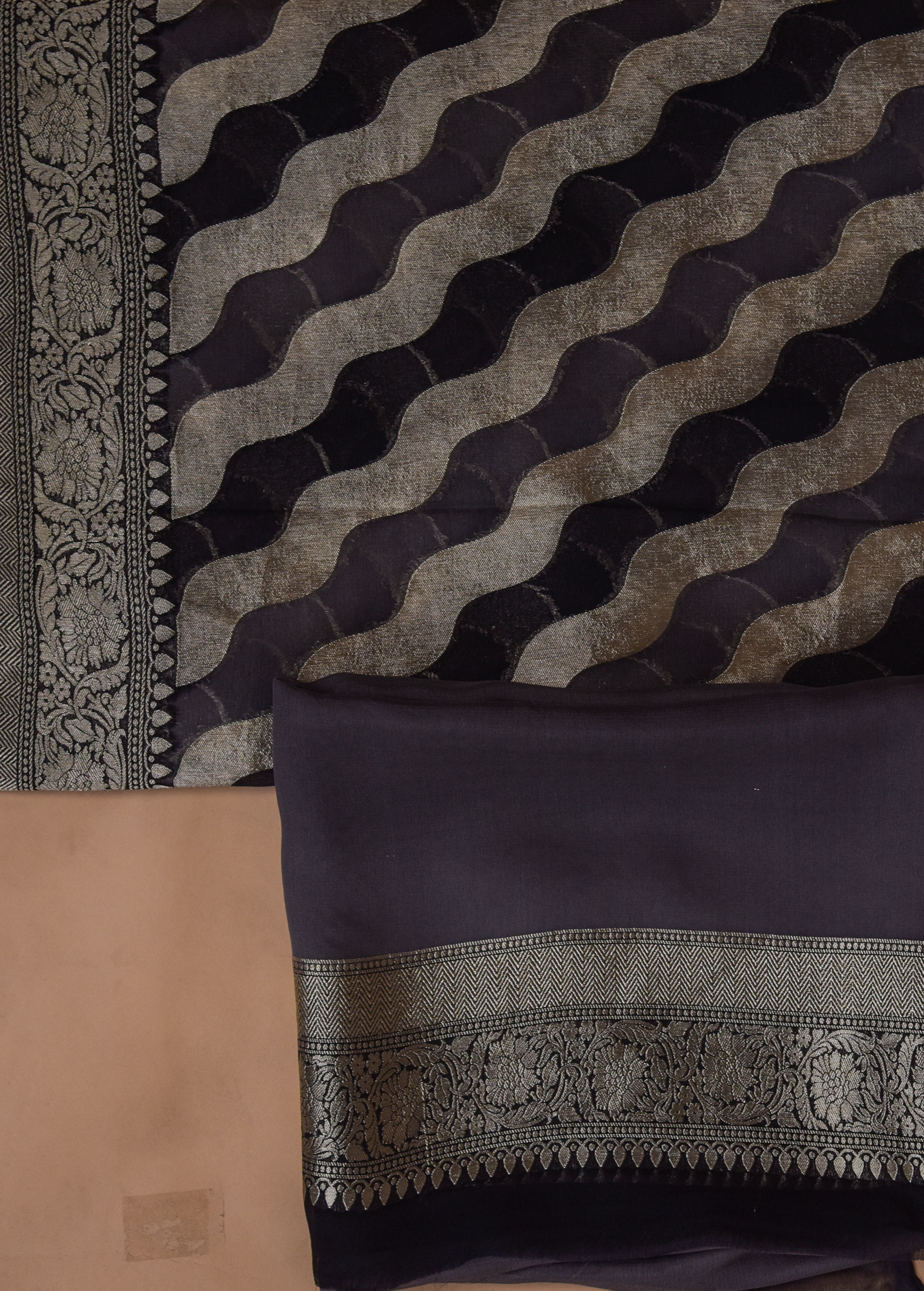 BANARASI KHADDI GEORGETTE SAREE WITH ABSTRACT DESIGN WOVEN IN GOLD ZARI ADONRNING AN INTRICATELY WOVEN BORDER AND PALLA.COMES WITH MATCHING BLOUSE