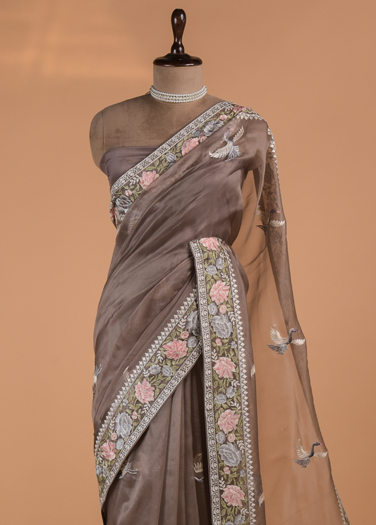 Brown Organza Embroidered Saree