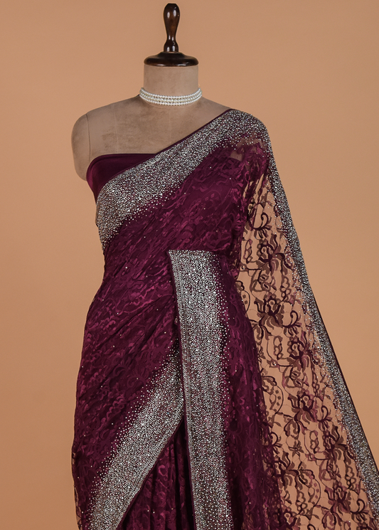 Wine Chantily Lace Embroidered Saree