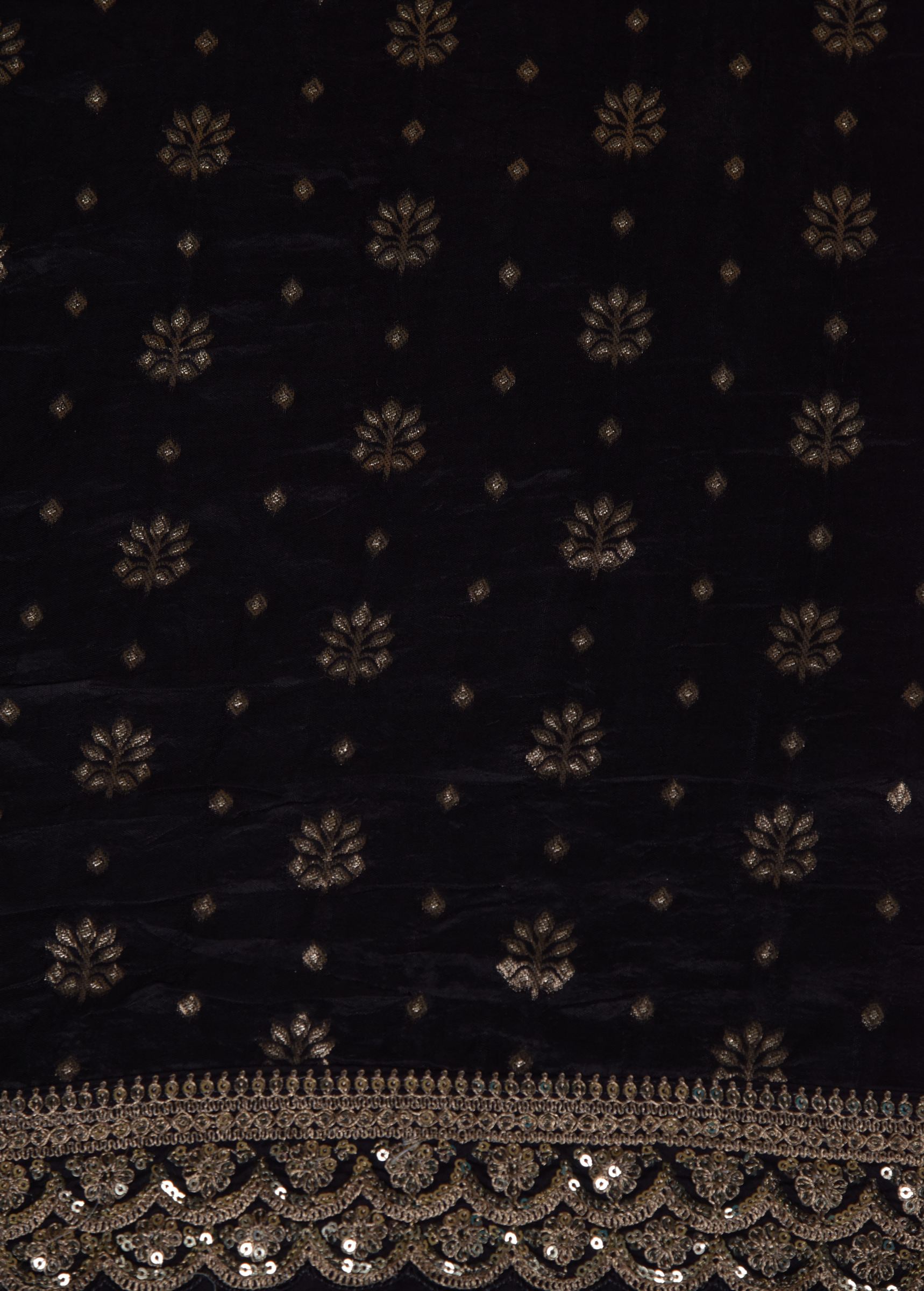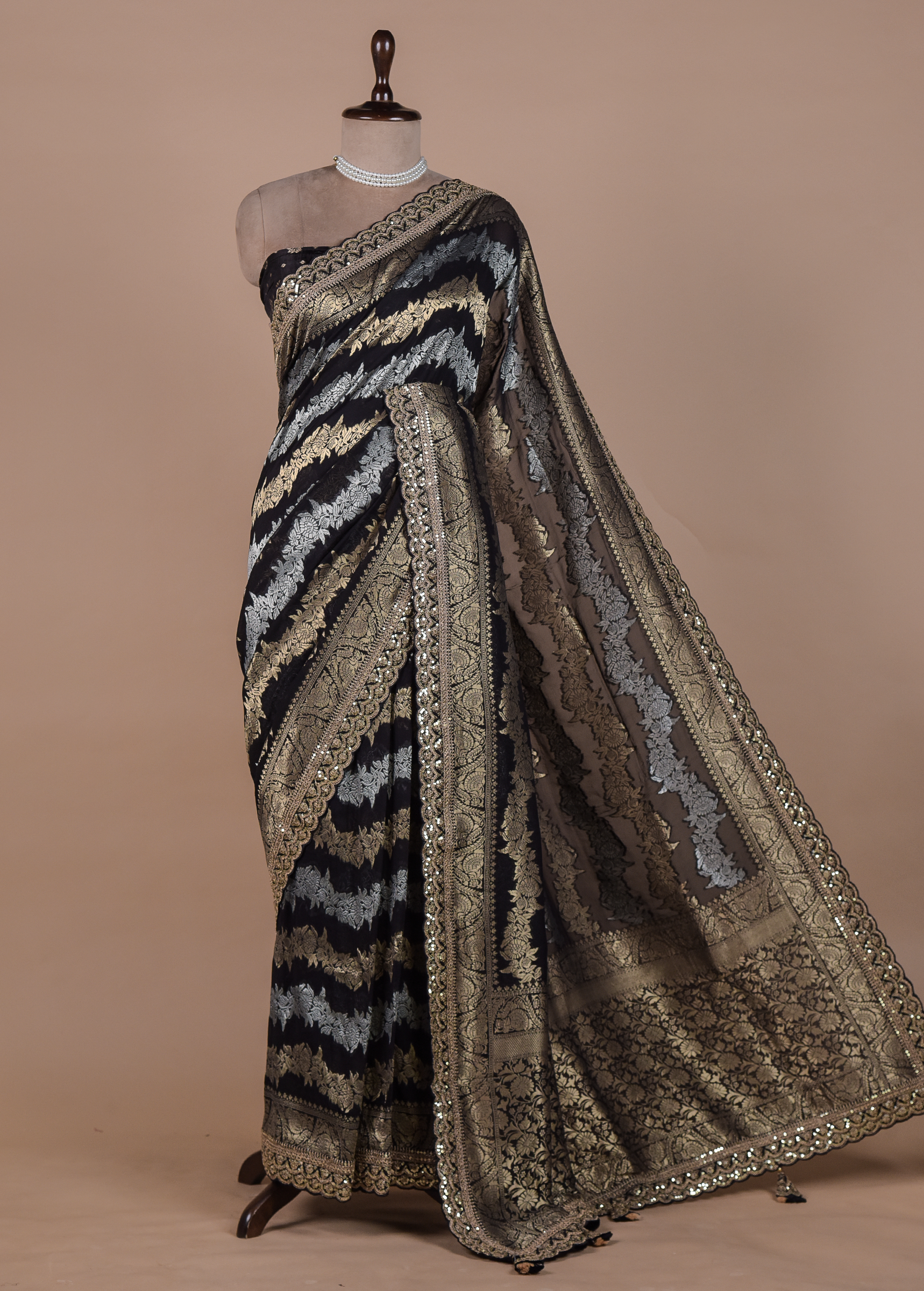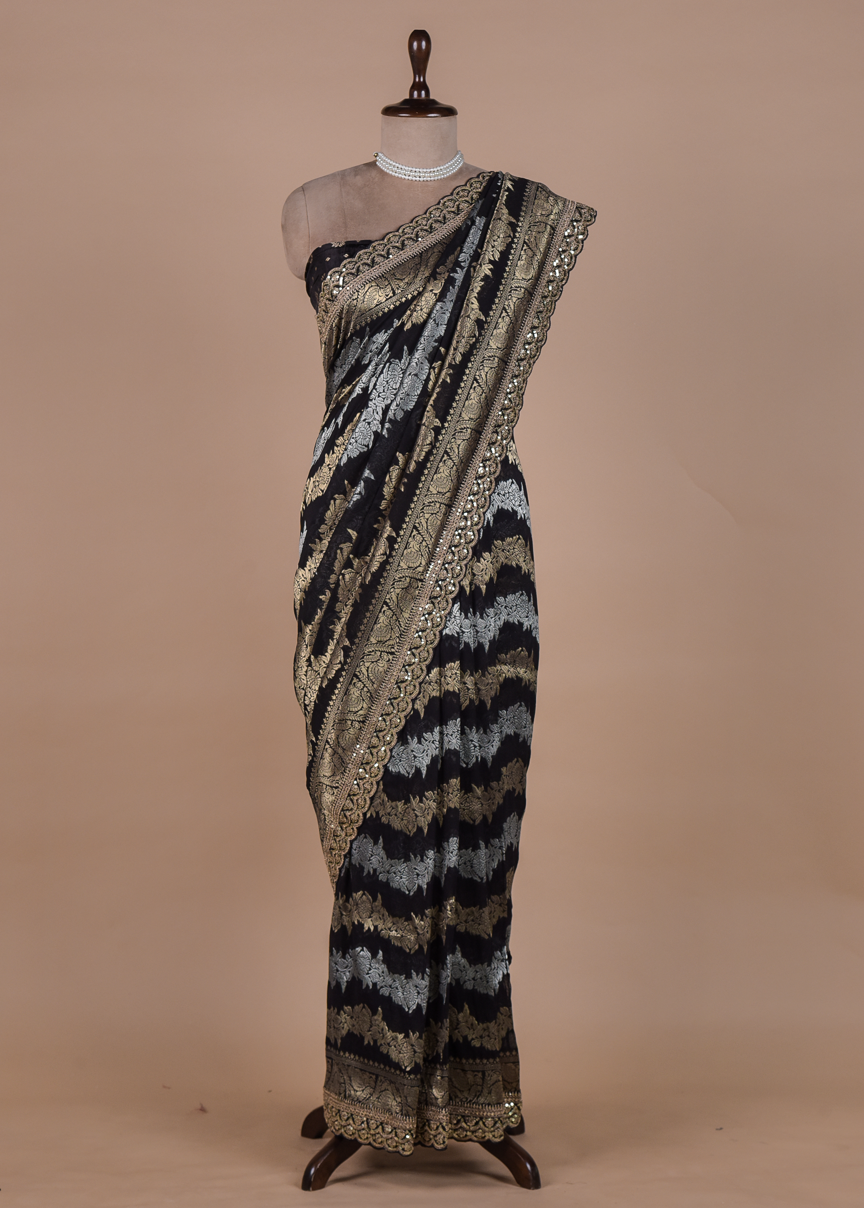 DOLA SILK SAREE WOVEN IN MUTLICOLOURED ZARI ADORNING A SCALLOPED BORDER WITH SEQUENCE EMBROIDERY.COMES WITH A MATCHING BLOUSE
