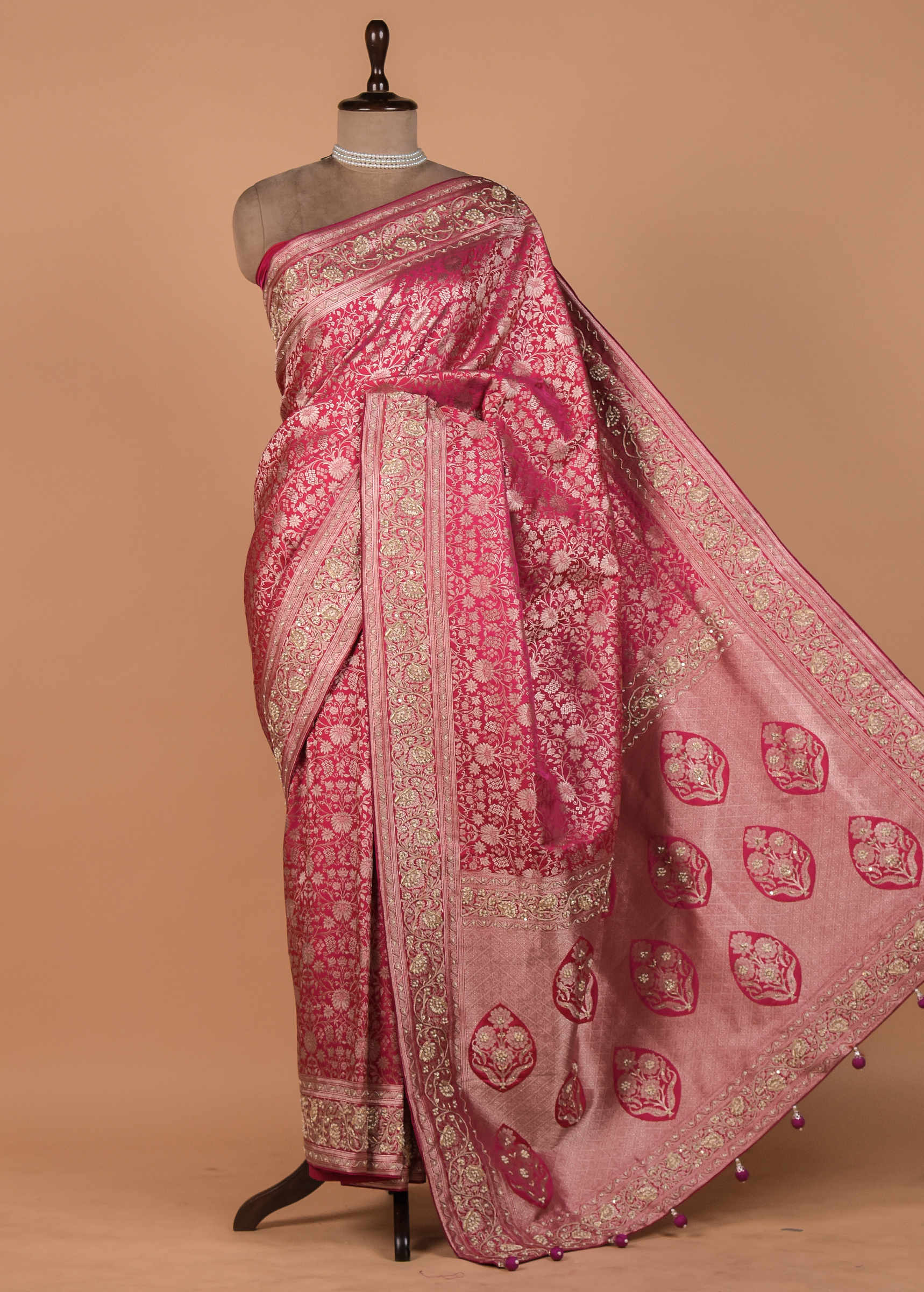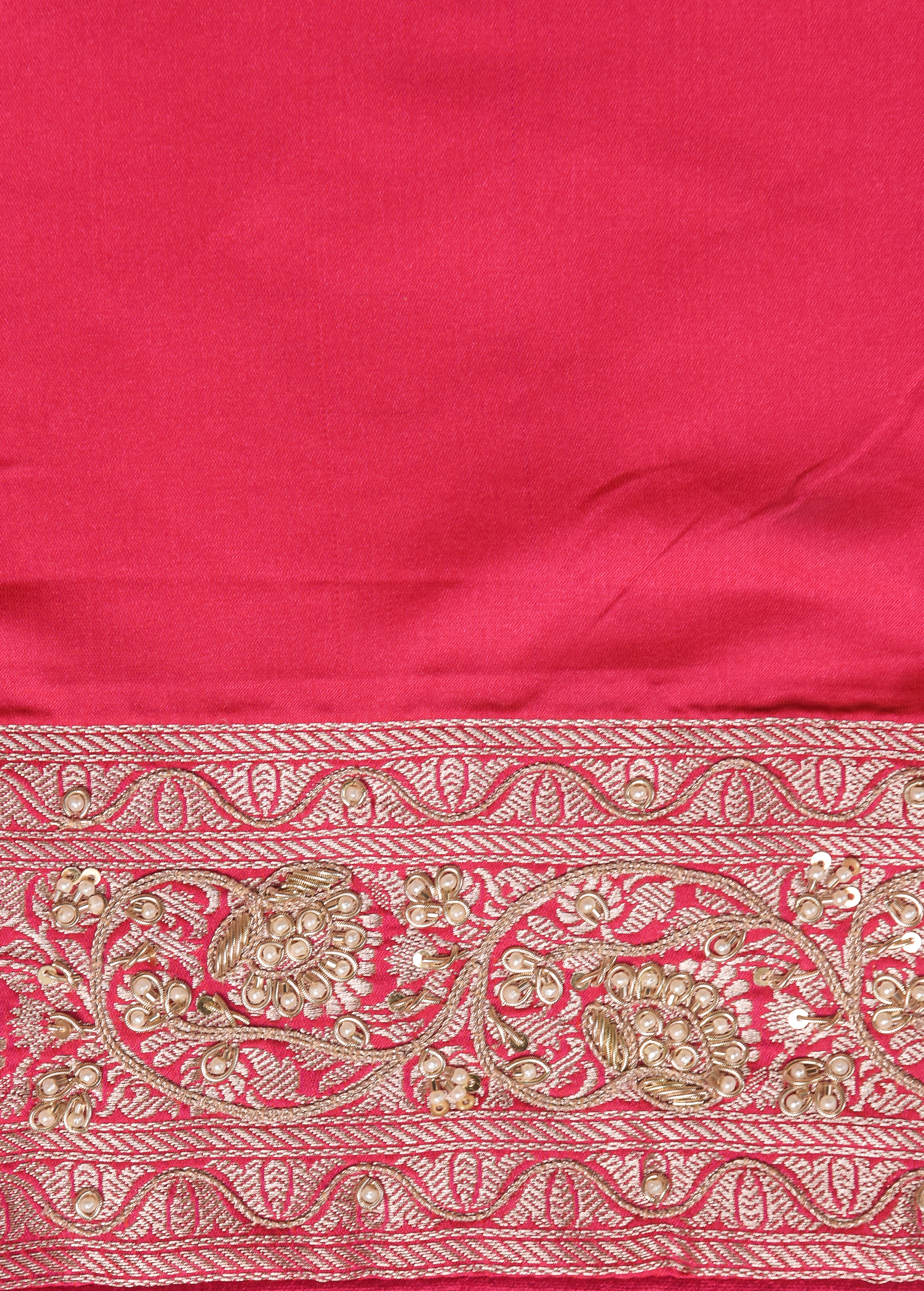 CLASSIC BANARASI SAREE WOVEN IN GOLD ZARI WITH BORDER EMBROIDERED WITH PEARL AND DABKA WORK.COMES WITH A MATCHING BLOUSE
