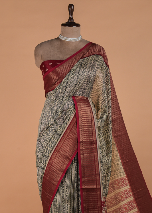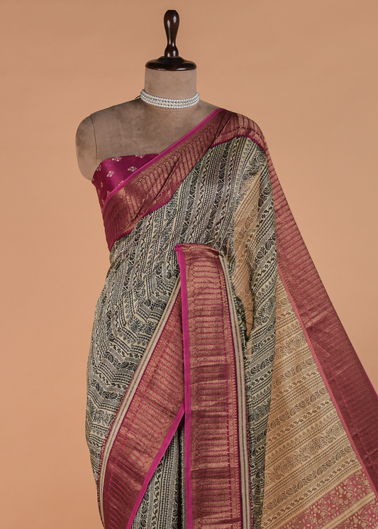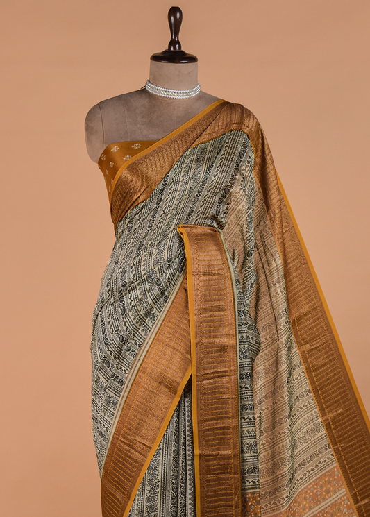 Beige Printed Cotton Saree | Greenways