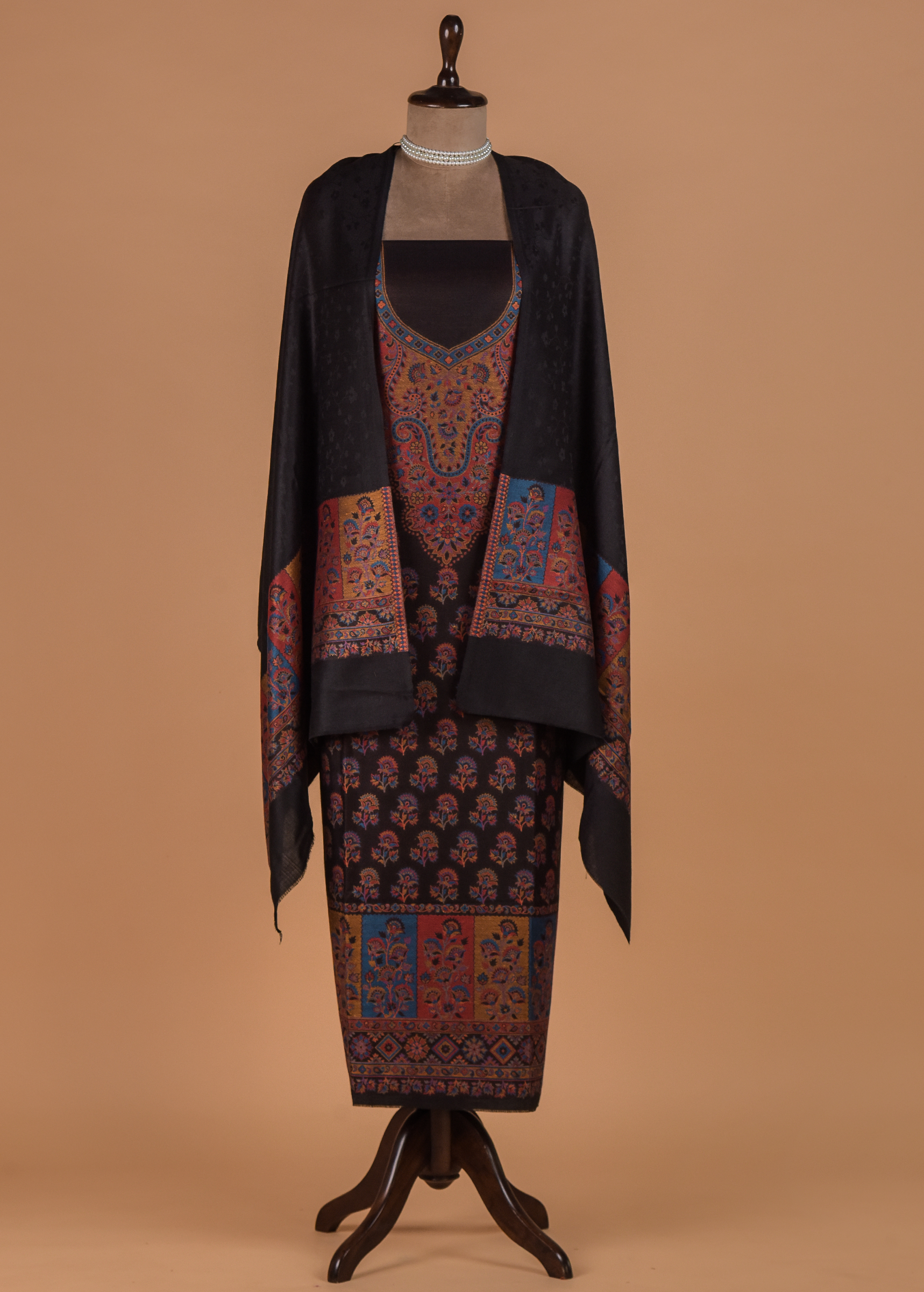 THREE PIECE PASHMINA SUIT SET WOVEN IN MULTICOLOURTED THREADS WITH MATCHING DUPATTA AND BOTTOM