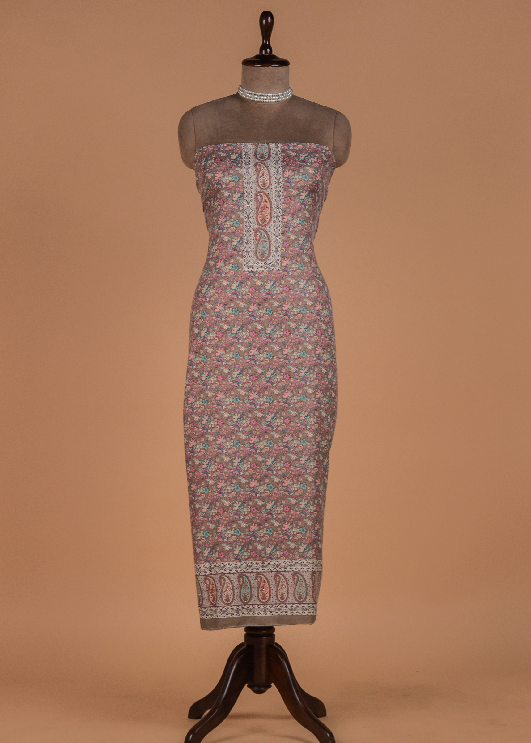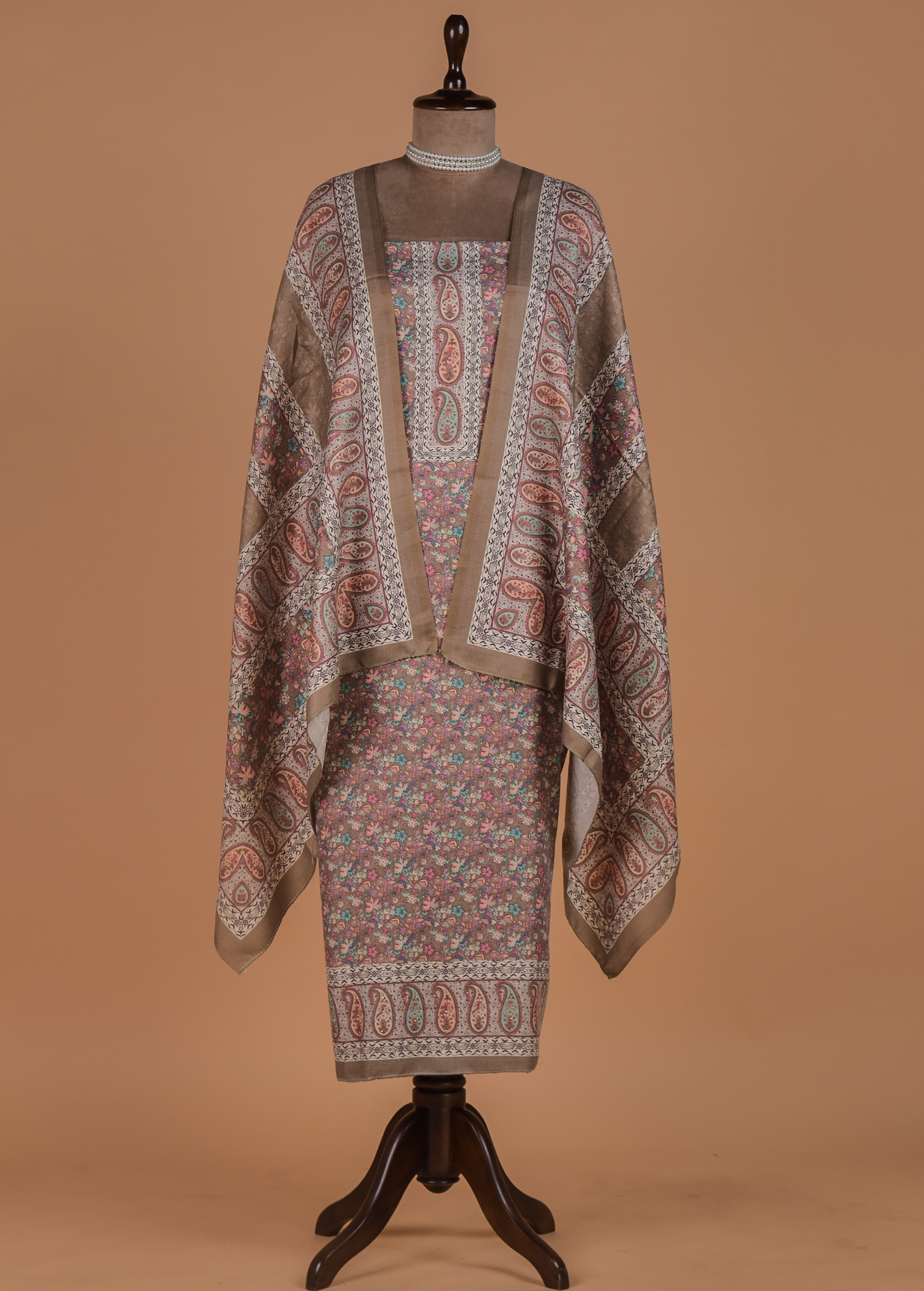 THREE PIECE PASHMINA SUIT SET WOVEN IN MULTICOURED THREADS WITH A MATCHING DUPATTA AND BOTTOM