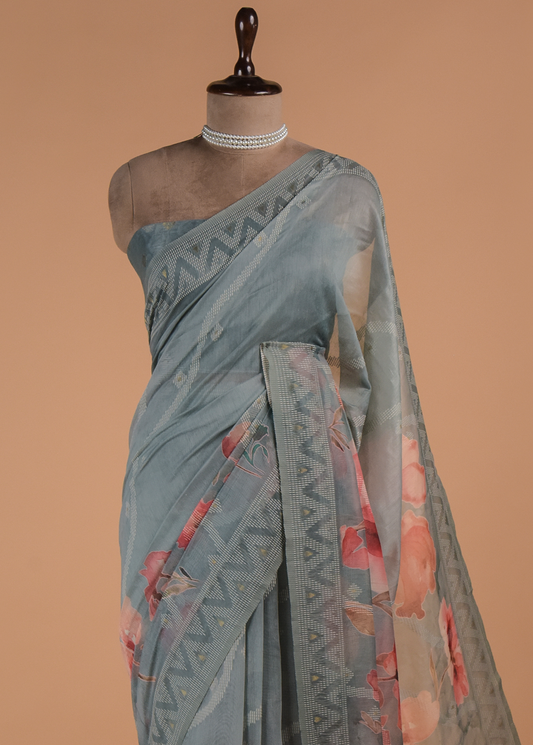 Blue Cotton Tussar Printed Saree