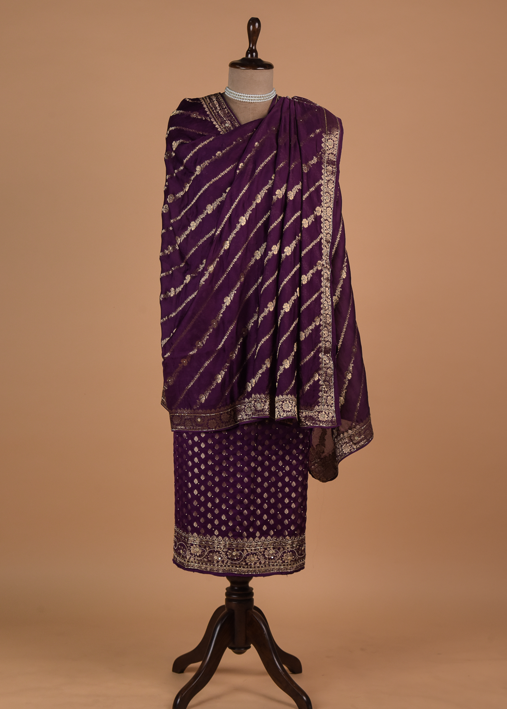 THREE PIECE BANARASI SUIT SET WOVEN IN GOLD ZARI ADORNING A MATCHING DUPATTA AND BOTTOM