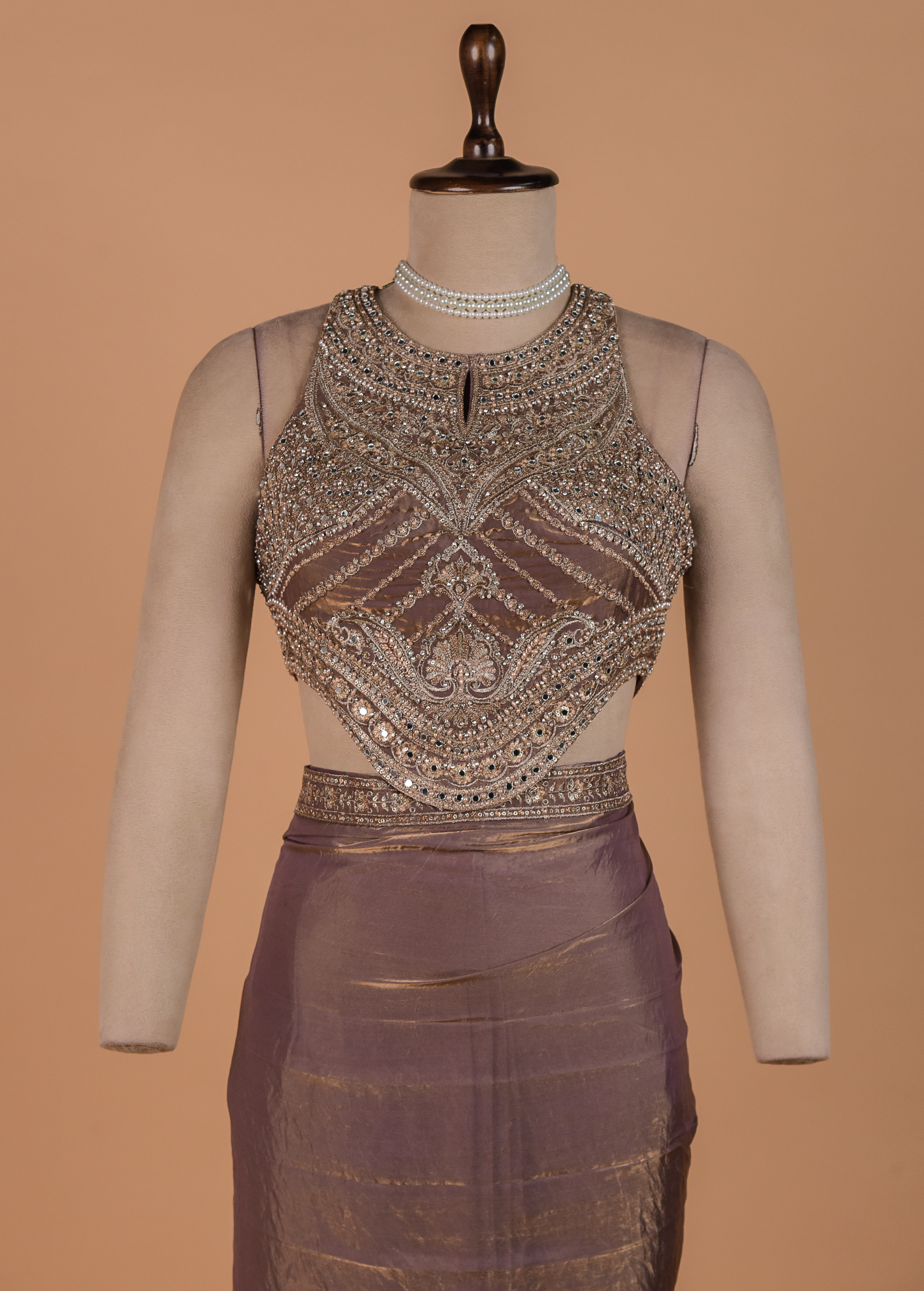 TWO PIECE READYMADE SAREE IN TISSUE GEORGETTE FABRIC WITH ZARI THREAD,MIRROR AND PEARL EMBROIDERY ON THE BORDER AND BLOUSE