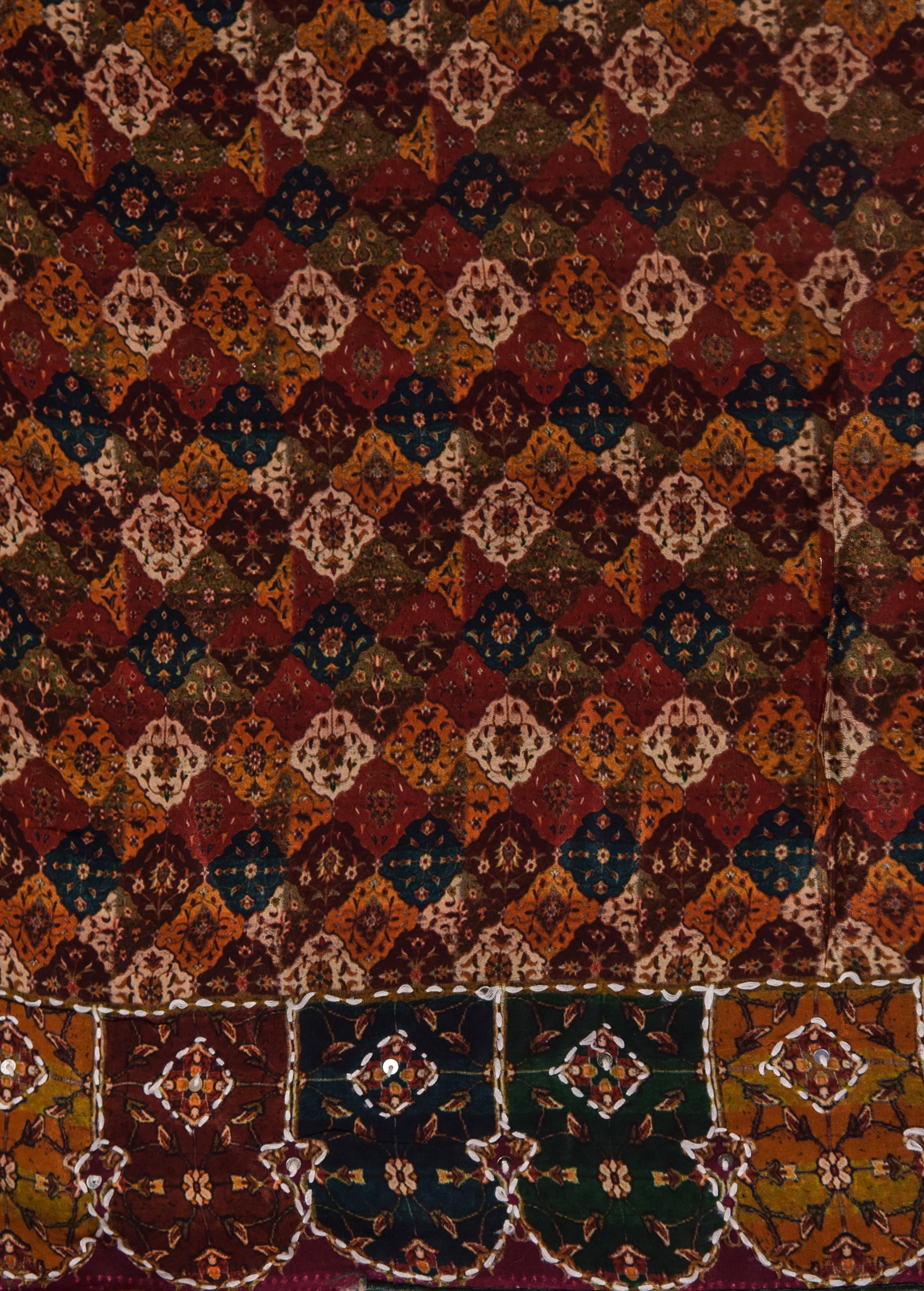 PRINTED CREPE SAREE WITH KANTHA EMBROIDER ADORNING A MATCHING BLOUSE