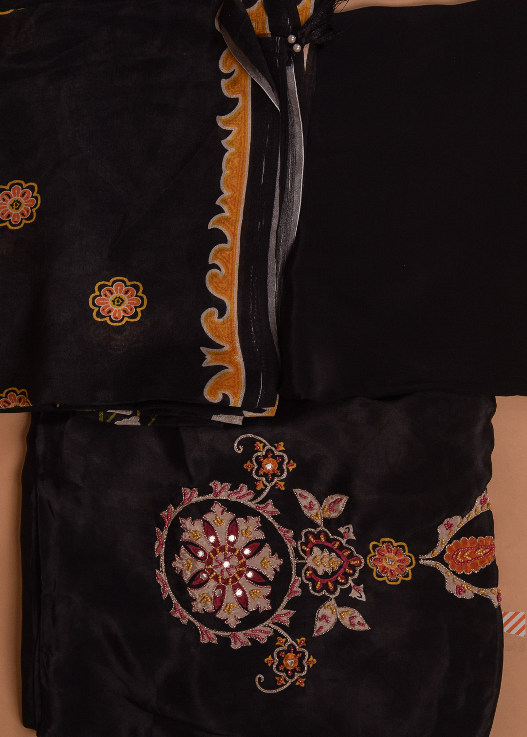 CREPE SILK THREE PEICE SUIT SET ADORNING ARTISTIC PRINT WITH EMBELISHMENTS, COMES WITH MATCHING DUPATTA AND BOTTOM