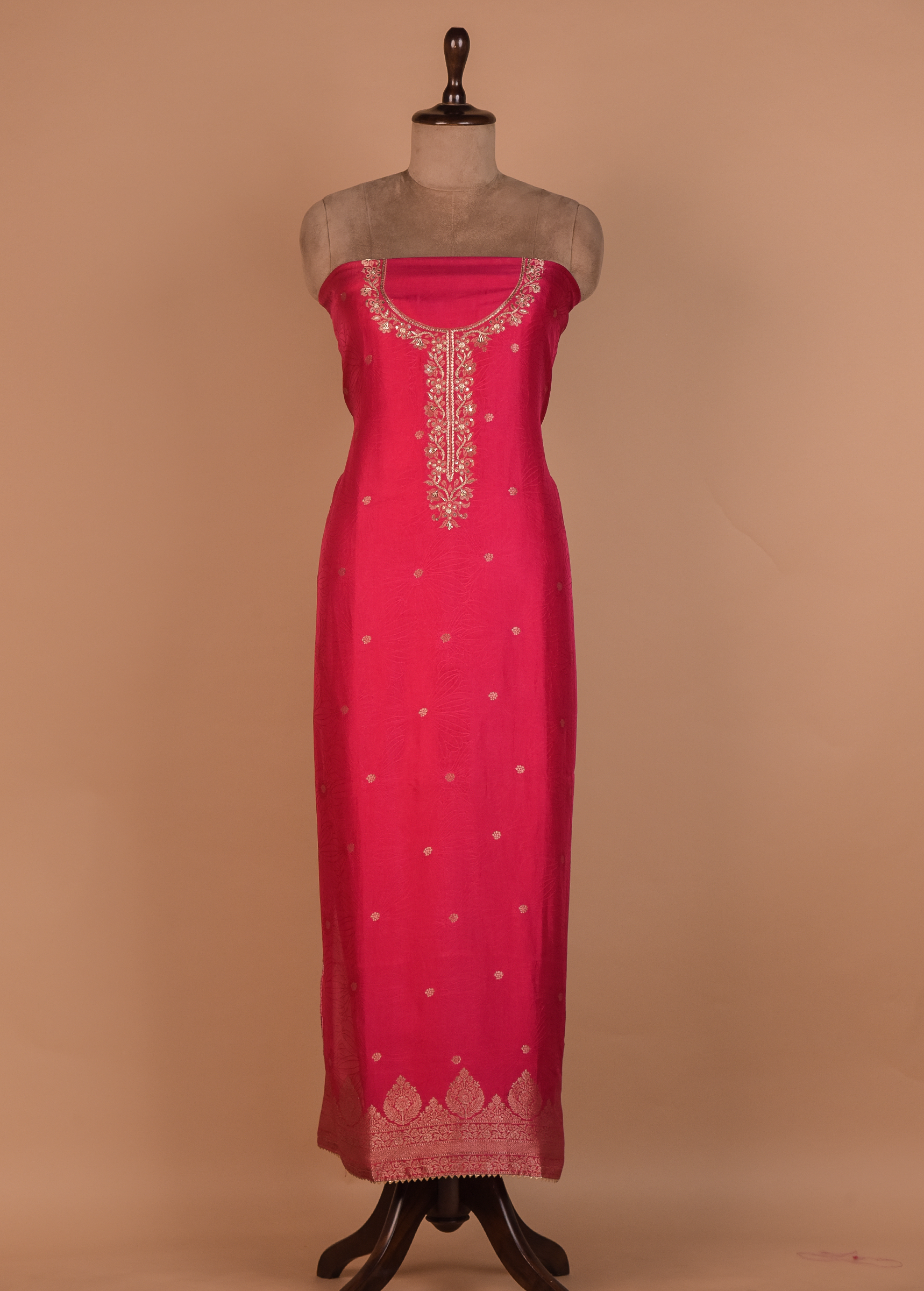 THREE PIECE SUIT SET WOVEN IN GOLD THREAD WITH EMBROIDERY ON THE NECK ADORNING A MATCHING DUPATTA AND BOTTOM