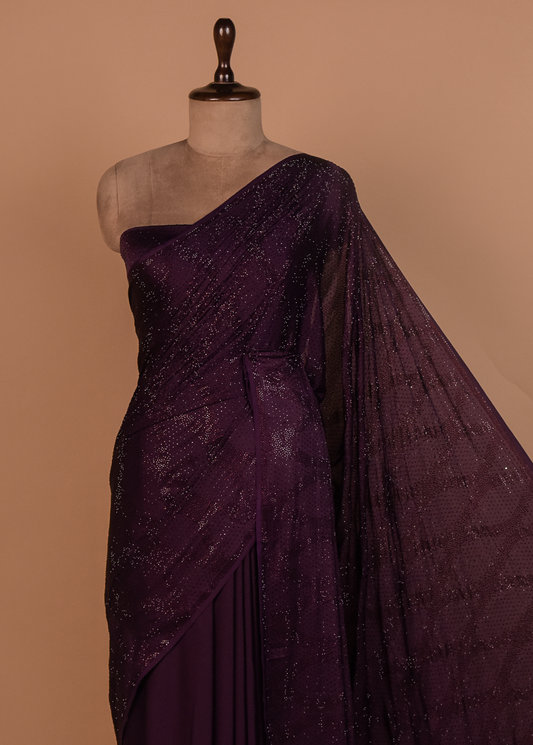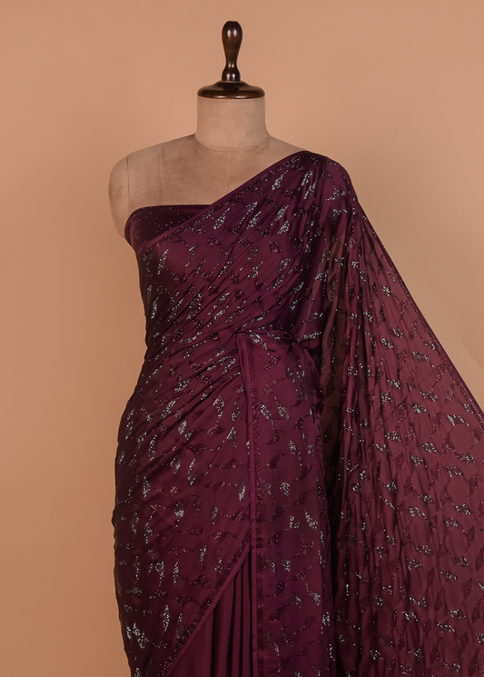 Wine Satin Embroidered Saree