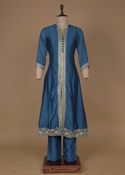 Blue Cotton Silk Straight Set