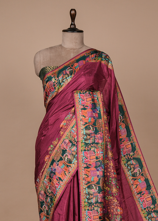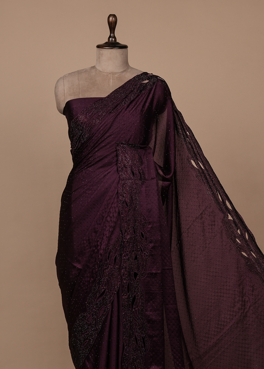 Wine Satin Embroidered Saree