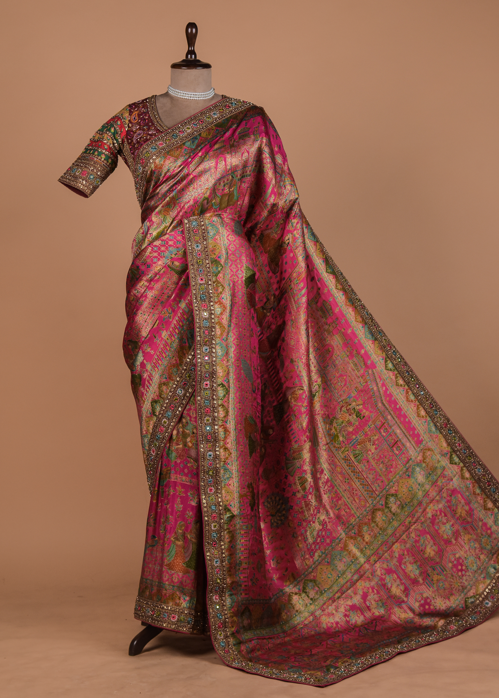 MOROCCAN SILK WOVEN SAREE WITH BORDER EMBROIDERED WITH ZARI AND MIRROR WORK ADORNING A MATCHING EMBROIDERED READYMADE BLOUSE