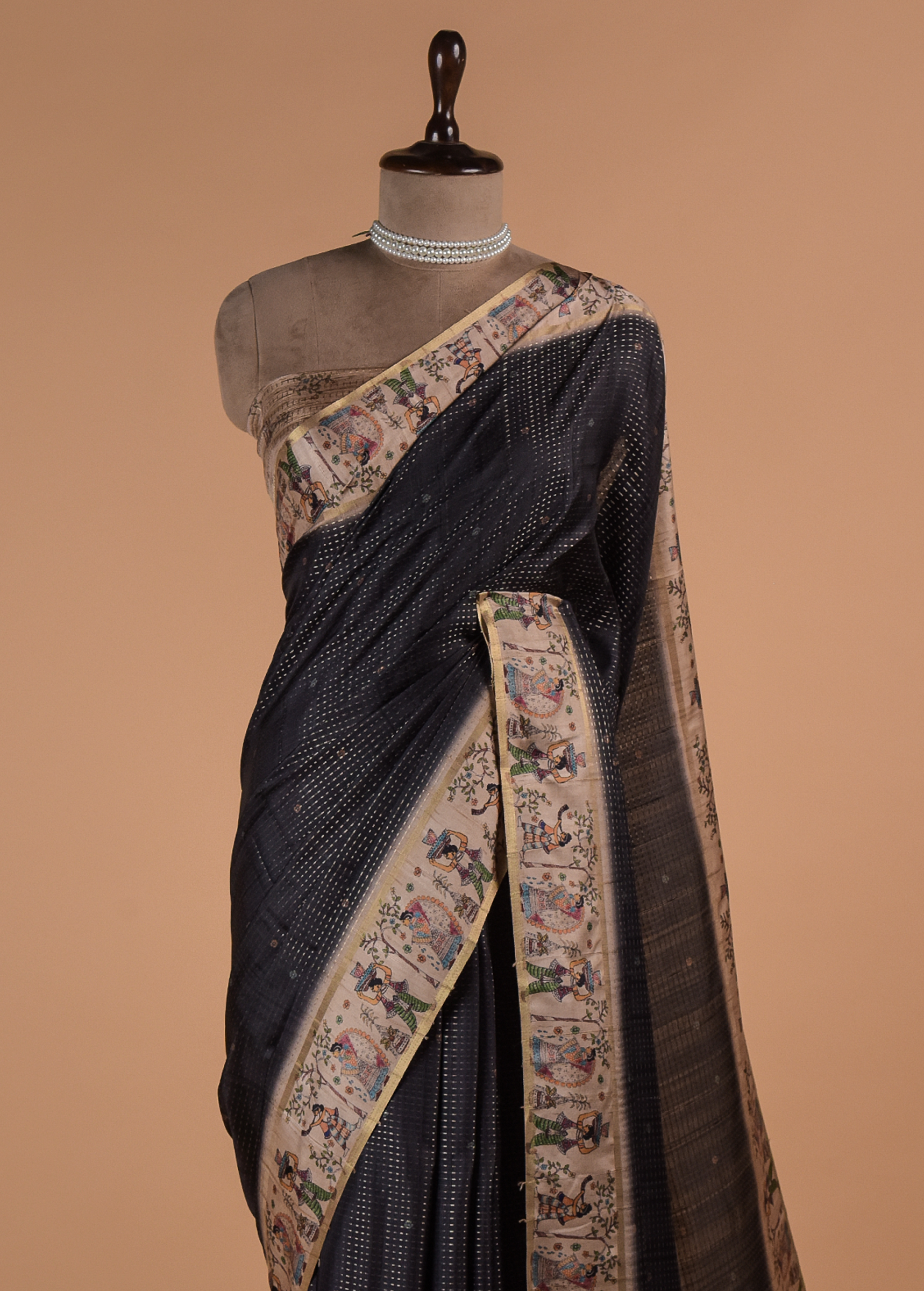 COTTON TUSSAR SAREE WITH MADHUBANI SKETCH PRINT ON THE BORDER ADORNING A MATCHING BLOUSE