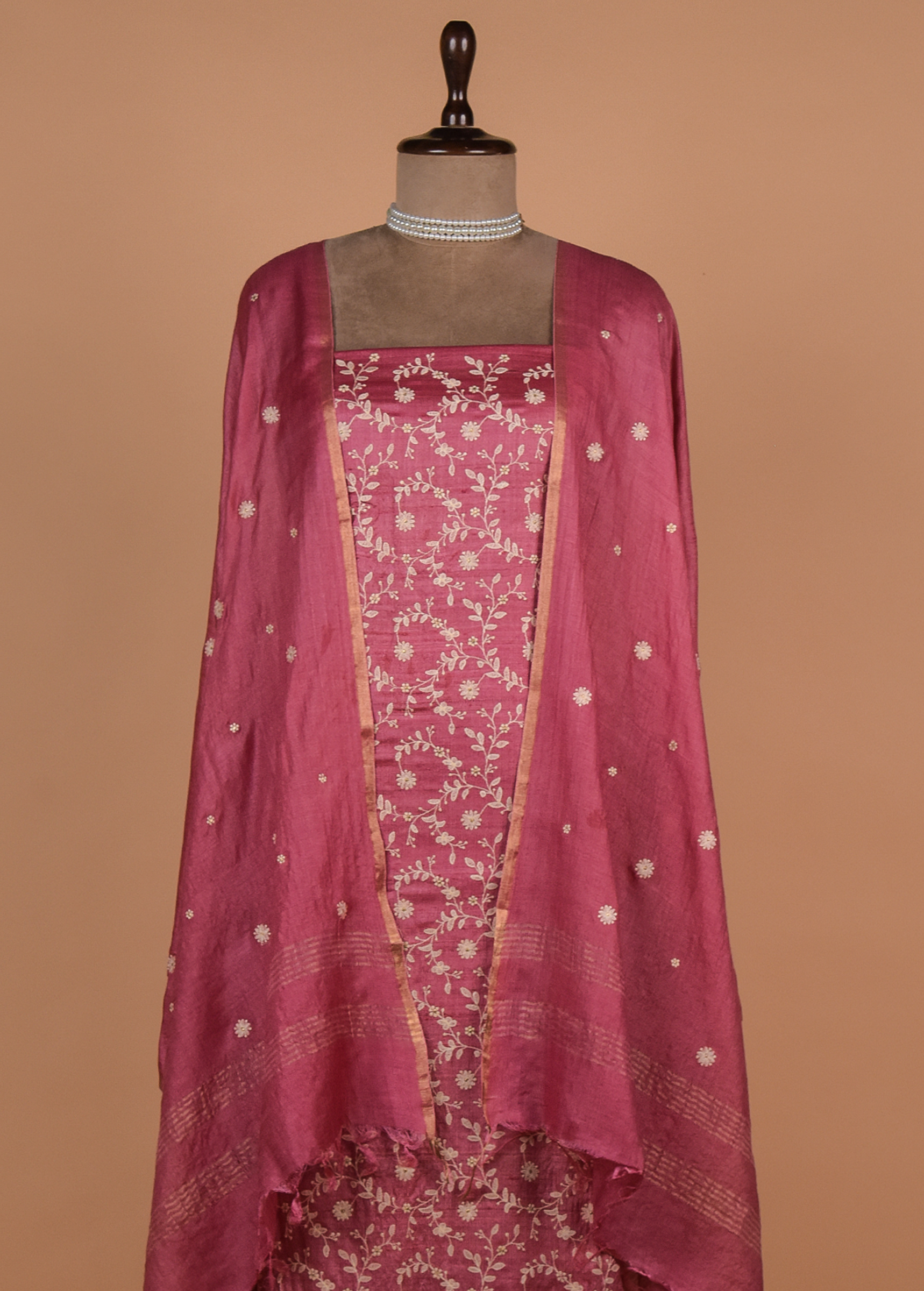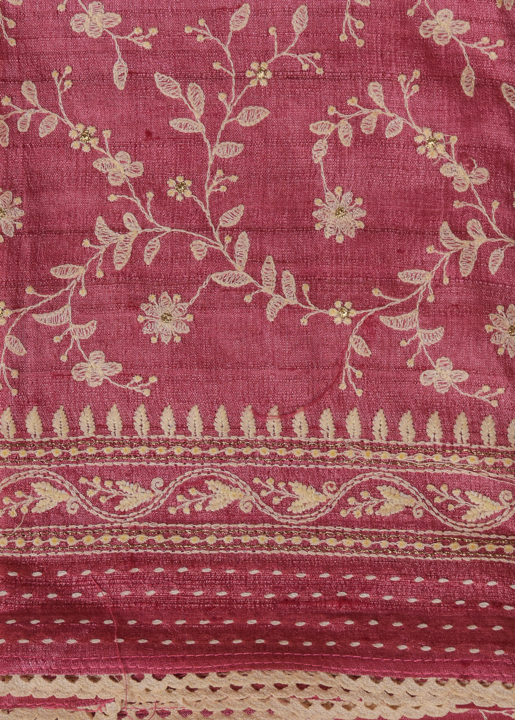 THREE PIECE TUSSAR SUIT SET ADORNING INTRICATE THREAD EMBROIDERY WITH A MATCHING DUPATTA AND BOTTOM