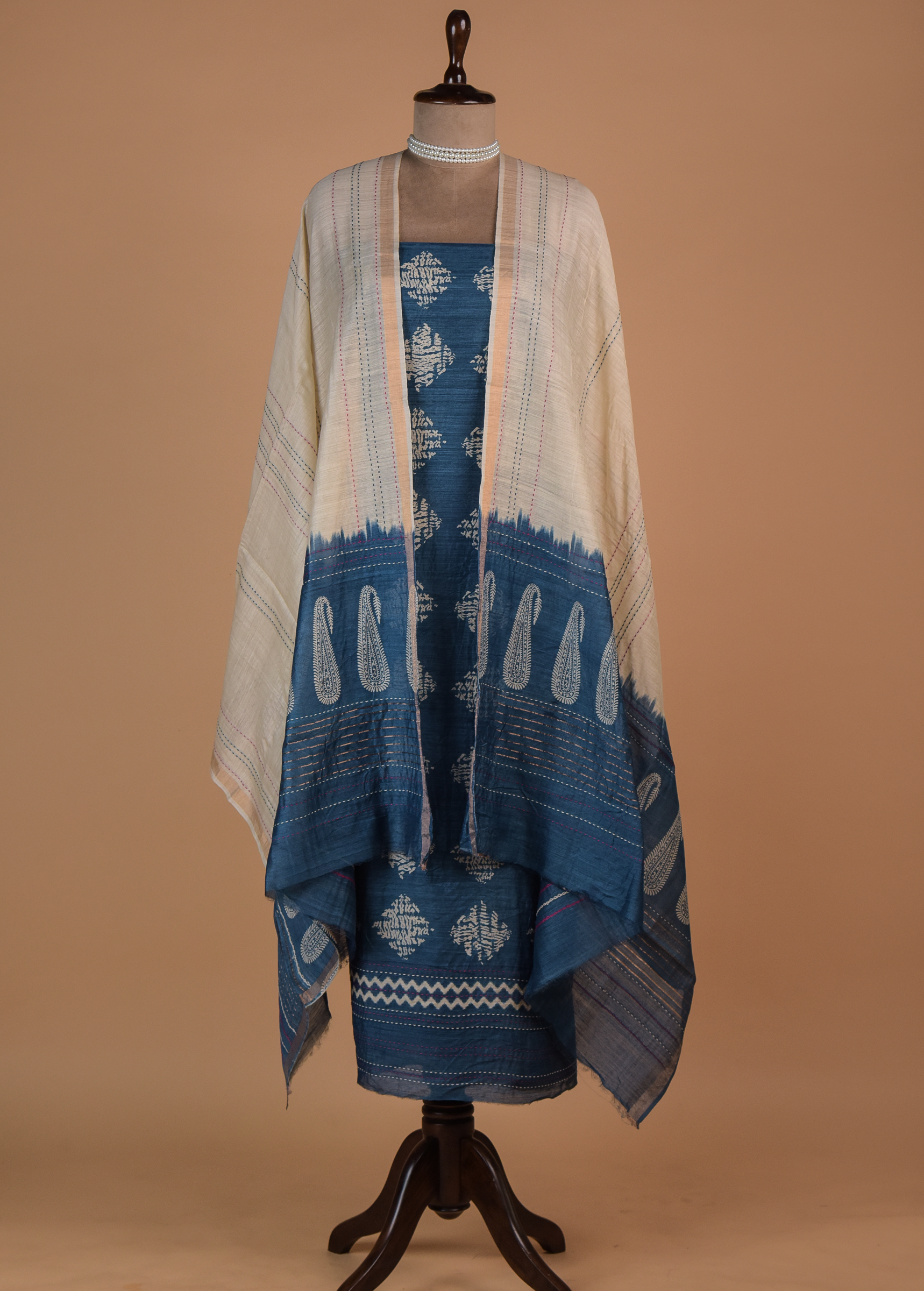 THREE PIECE TUSSAR SUIT SET WITH SHIBORI PRINT AND KANTHA EMBROIDERY ADONRNING A MATCHING DUPATTA AND BOTTOM