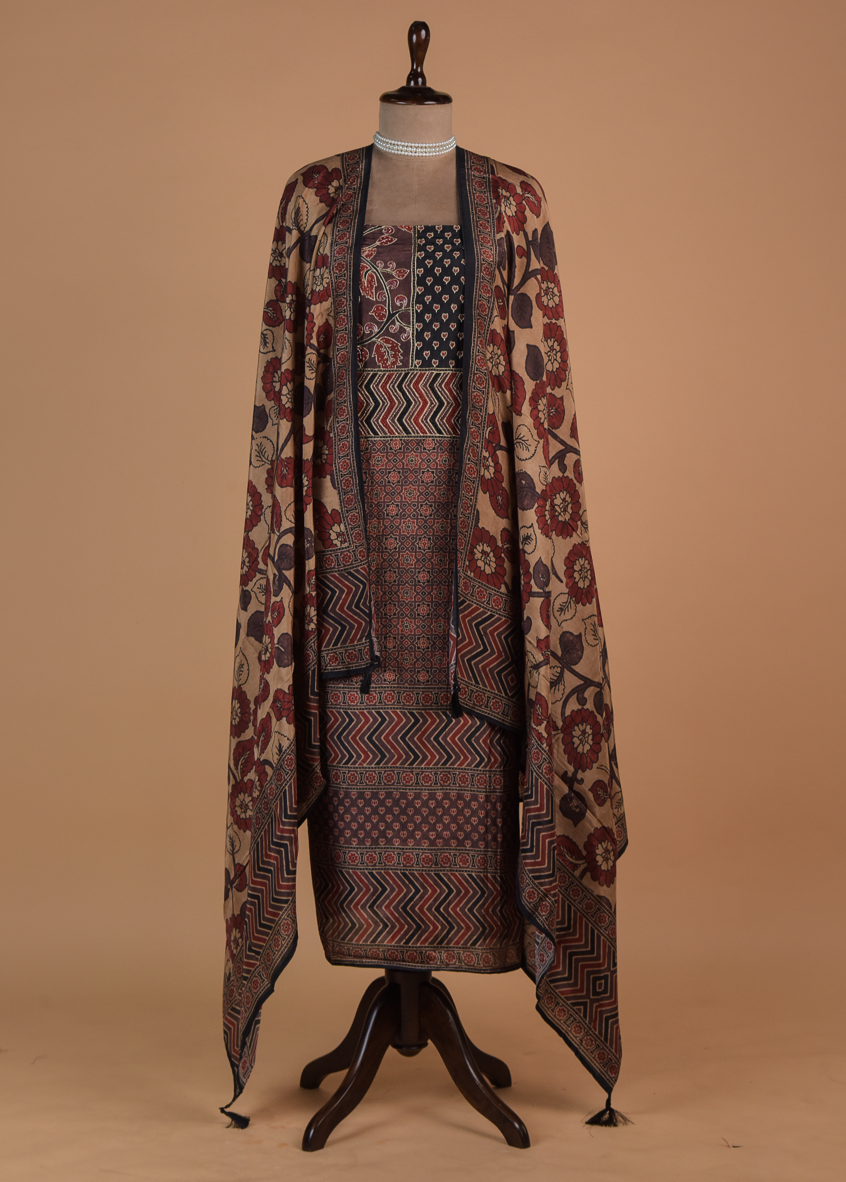 THREE PIECE CREPE SUIT SET WITH AJRAK PRINTING HIGHLIGHTED WITH ZARI AND MIRROR WORK ADORNING A MATCHING DUPATTA AND BOTTOM