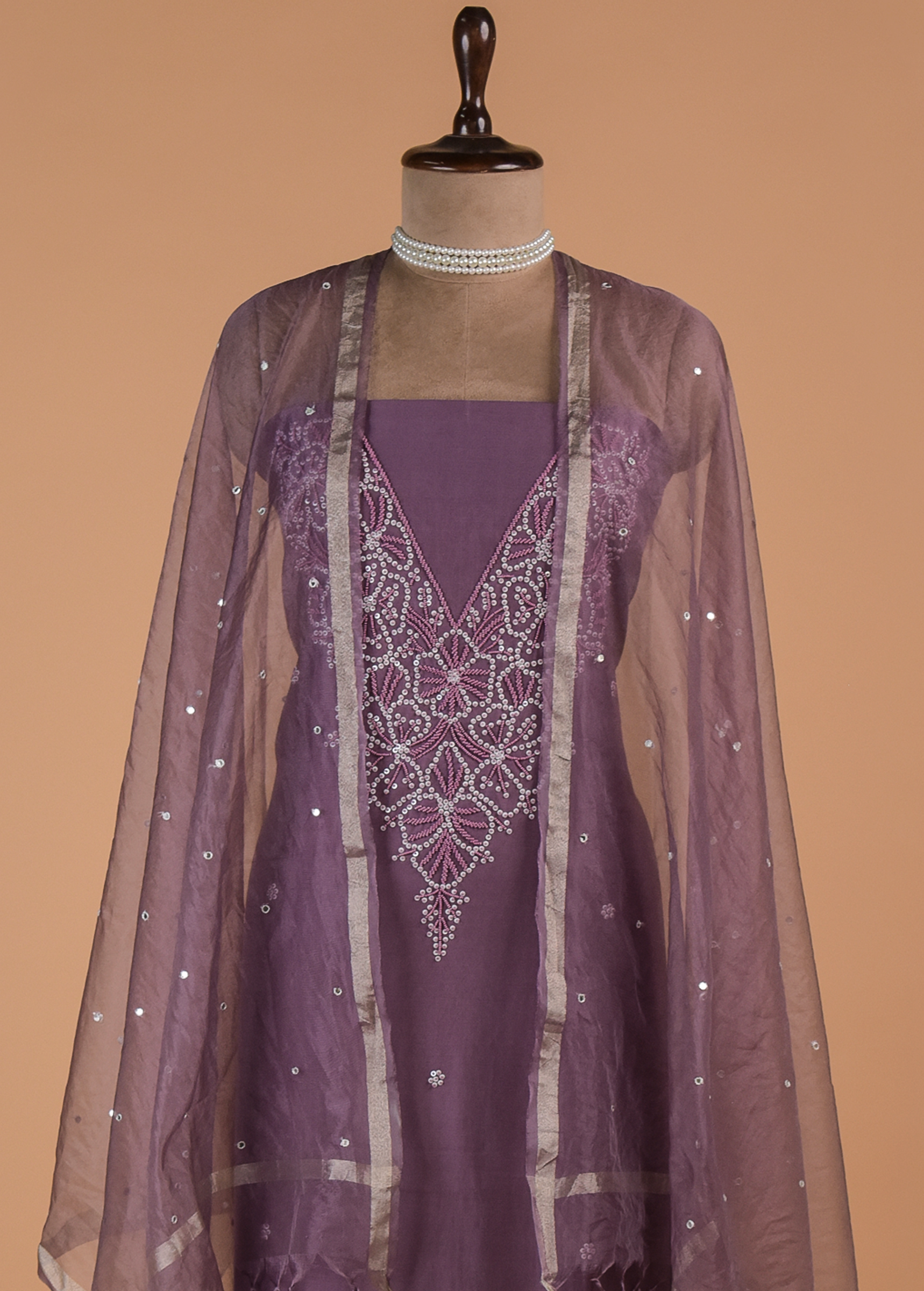 THREE PIECE SUIT SET IN COTTON ADORNING EMBROIDERY ON THE NECK WITH A MATCHING DUPATTA AND BOTTOM