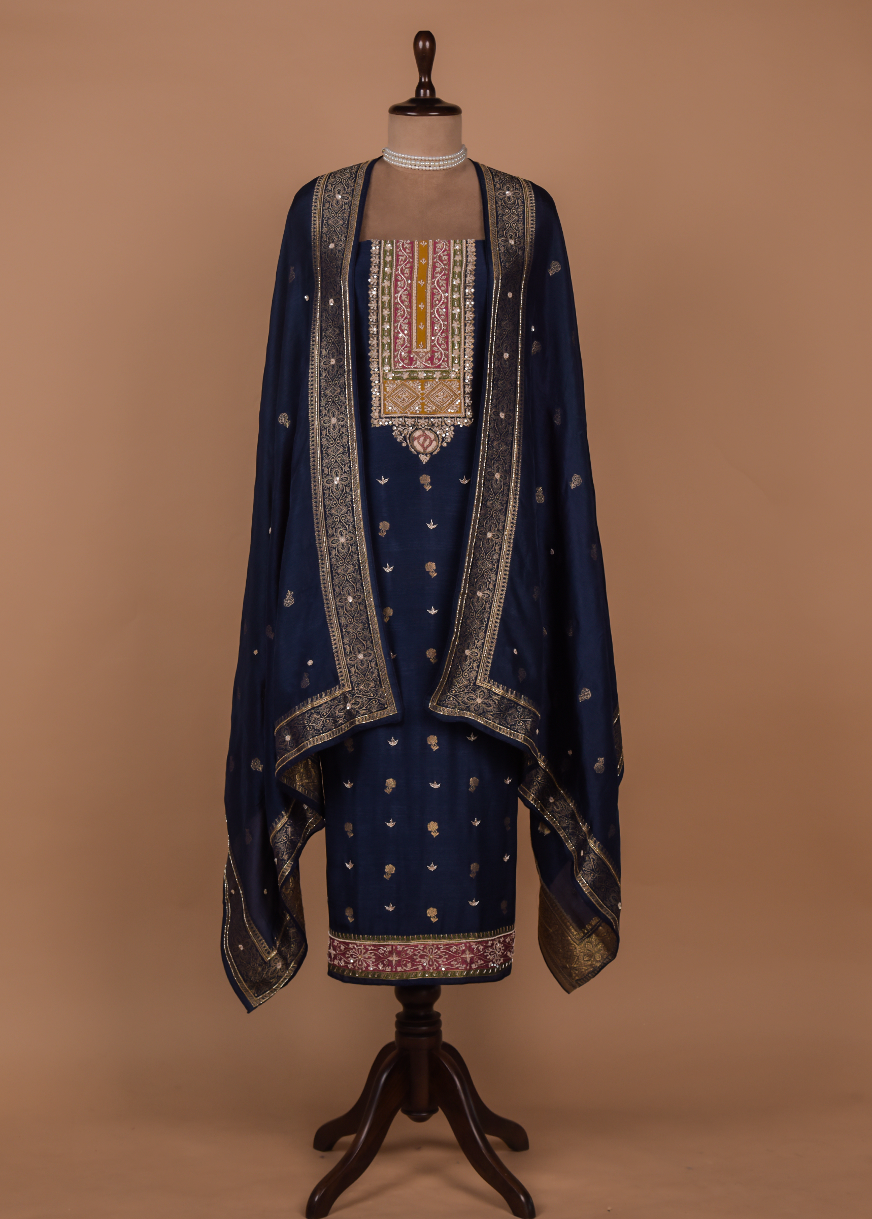 THREE PIECE SUIT SET WITH MOTIFS WOVEN IN GOLD ZARI EMBELLISHED GOLD ZARI EMBROIDERY ADORNING A MATCHING DUPATTA AND MATCHING BOTTOM