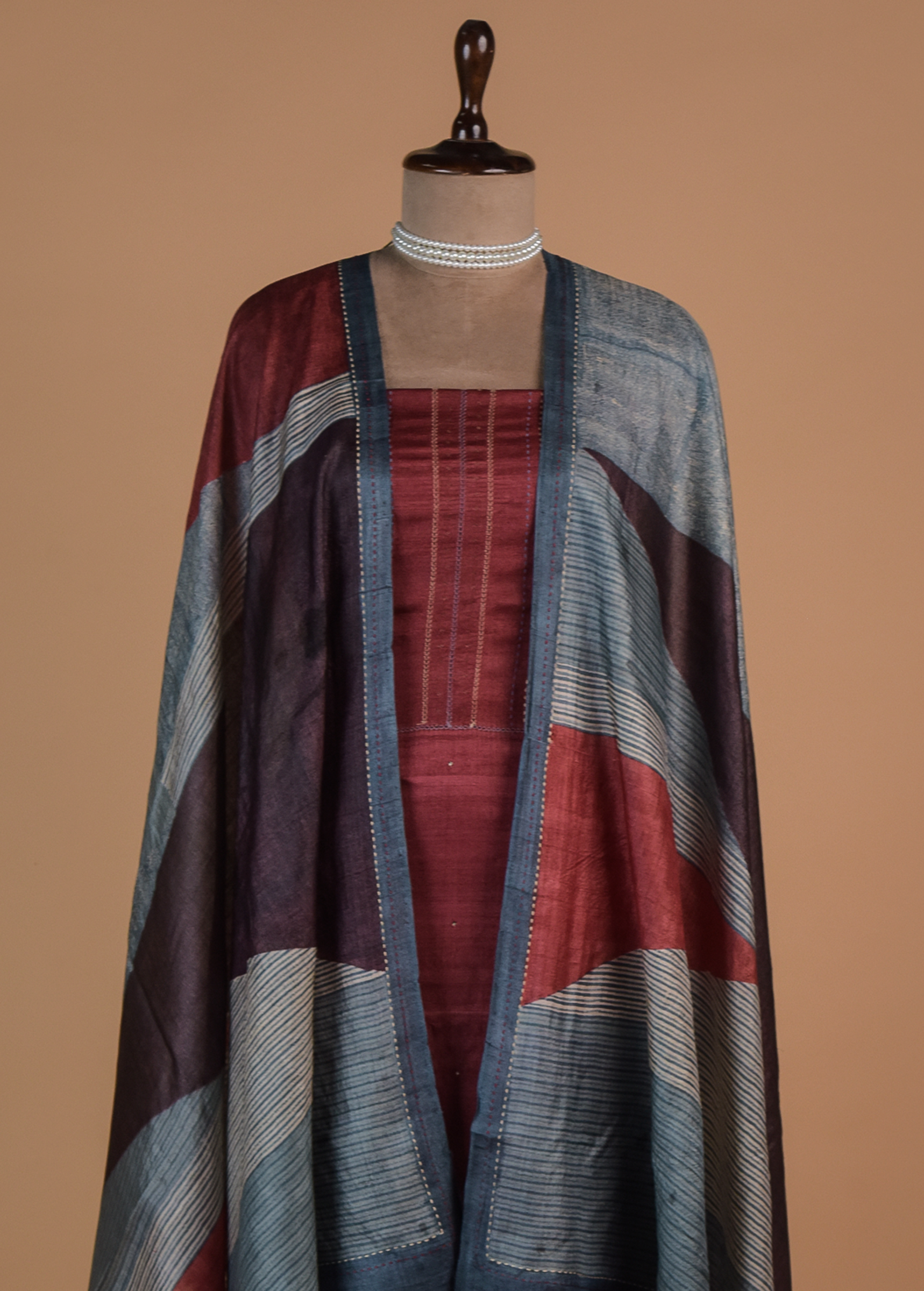 THREE PIECE TUSSAR SUIT SET WITH KANTHA EMBROIDERY ADORNING A MATCHING DUPATTA AND BOTTOM