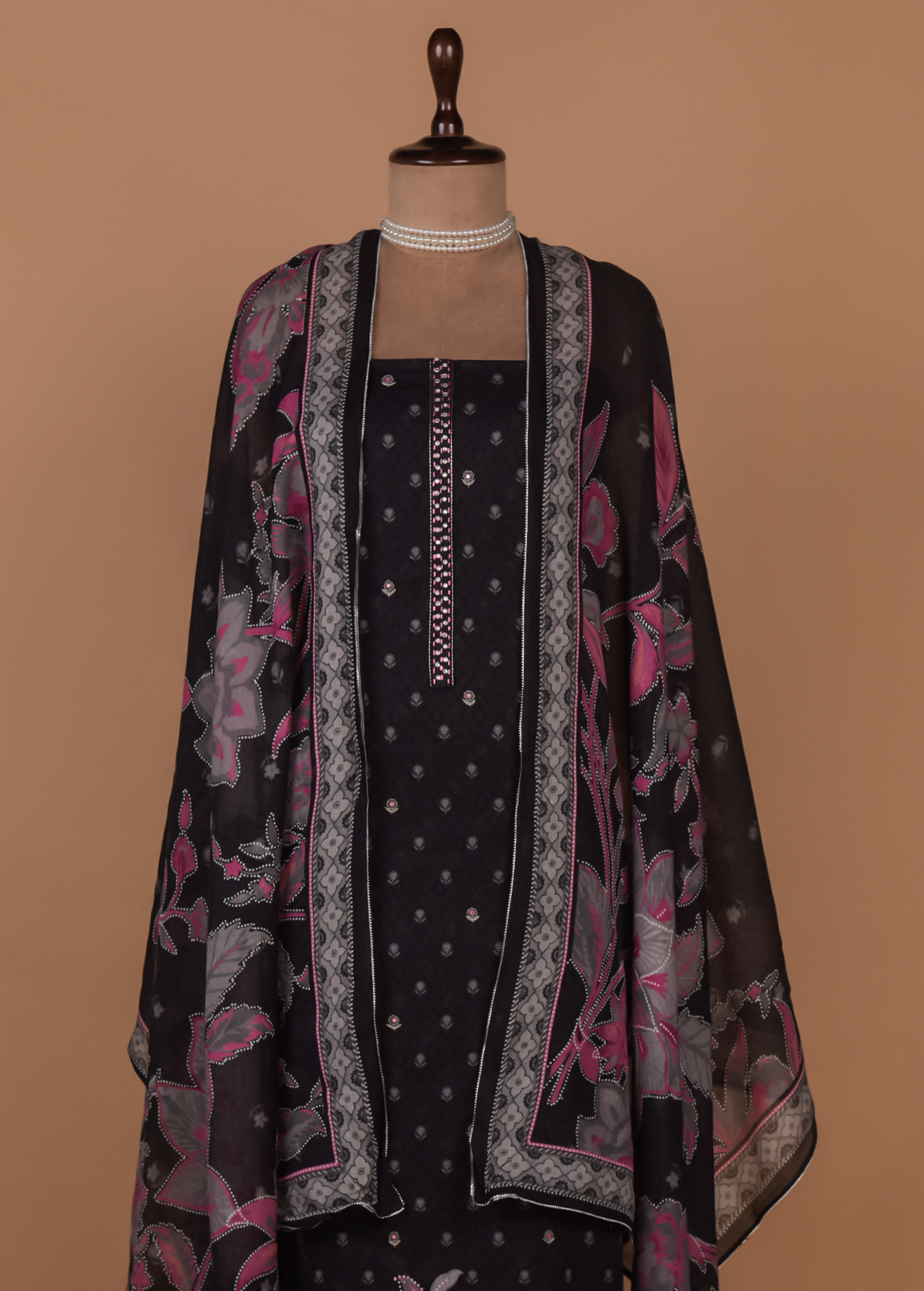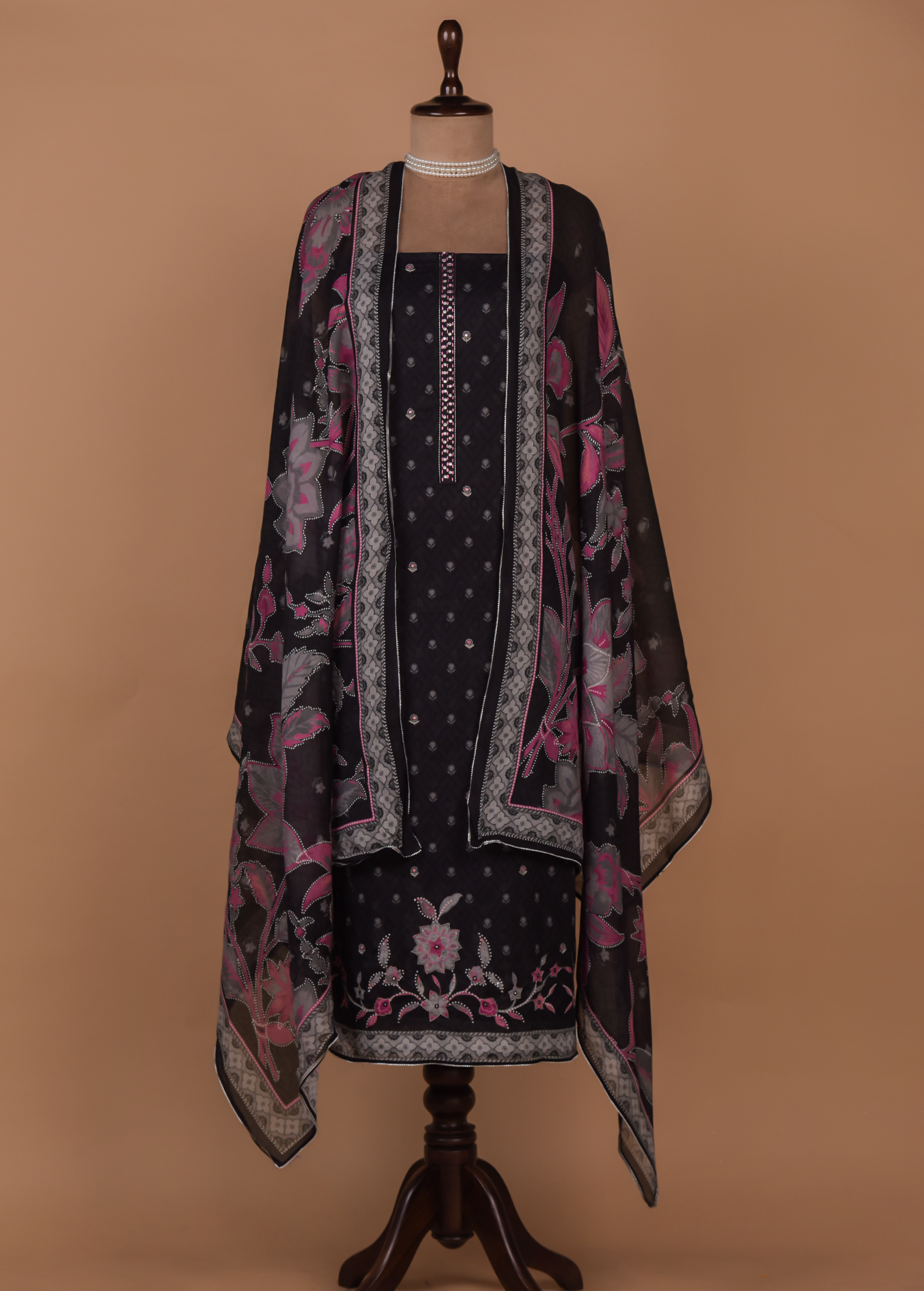 THREE PIECE PRINTED CREPE SUIT SET WITH EMBELLISHMENT ADORNING A MATCHING DUPATTA AND BOTTOM